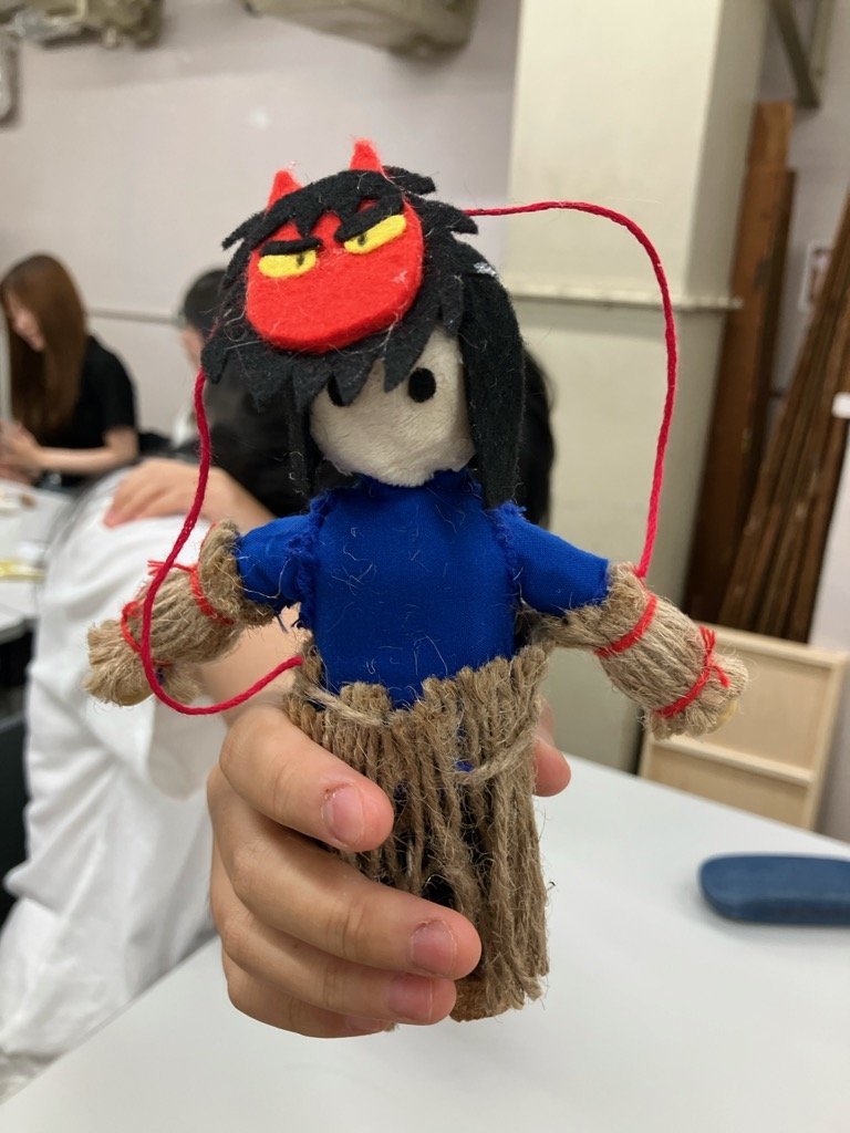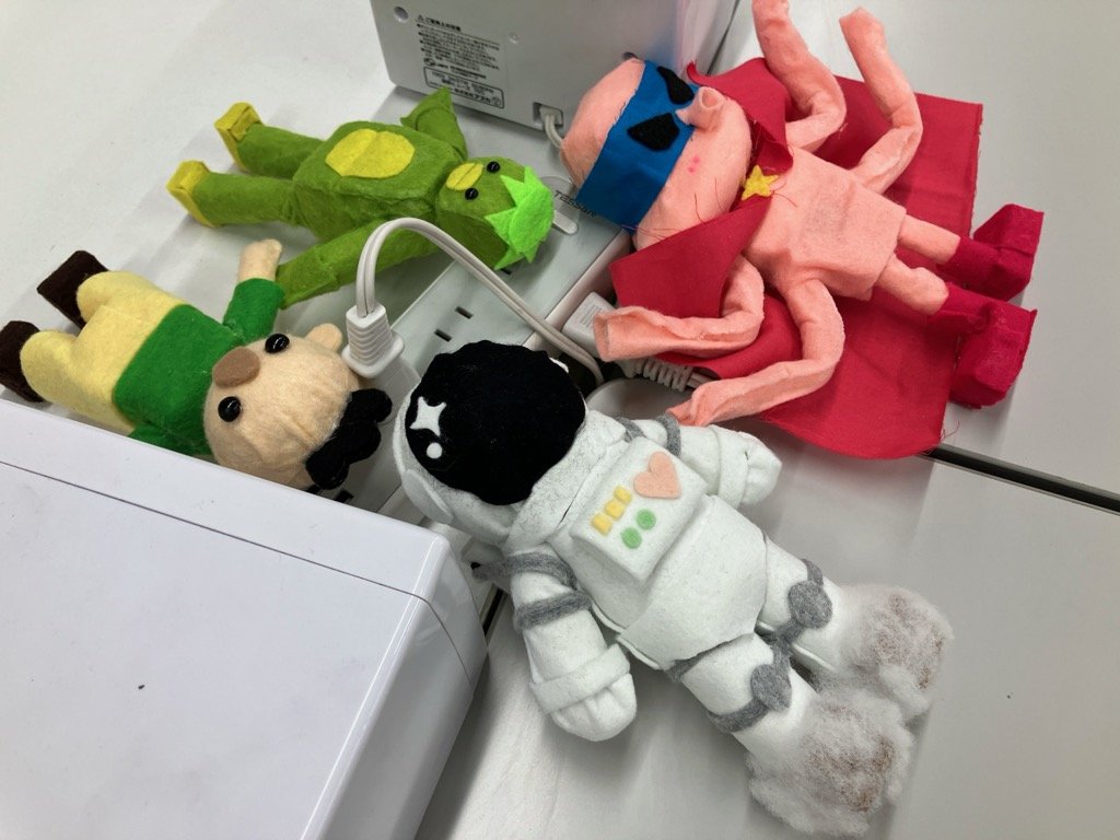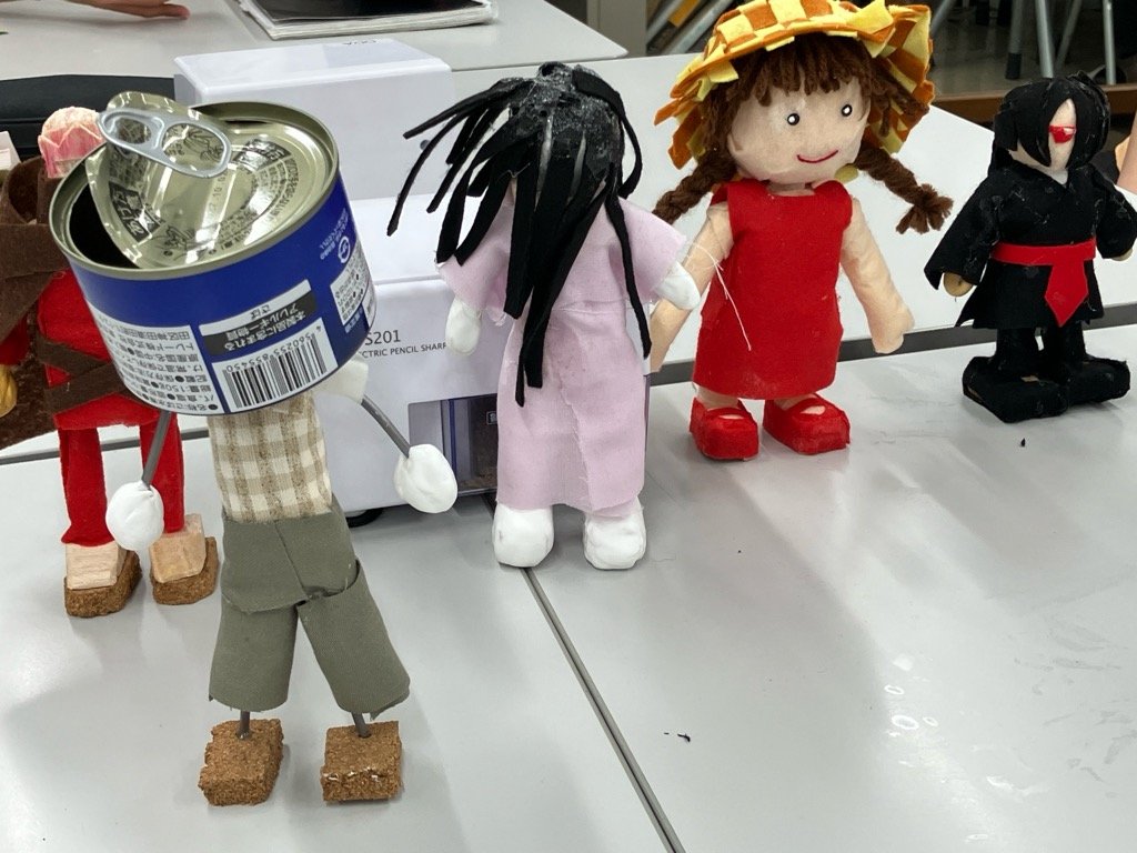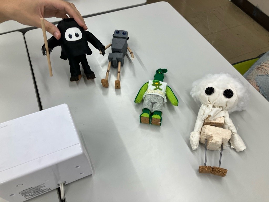 後期「アニメワーク」では、ストップモーションアニメーションのグループワークに取り組みます。宿題で作成して持ち寄ったキャラクターをグループメンバーで見せ合って、ストーリーを創作し始めました。