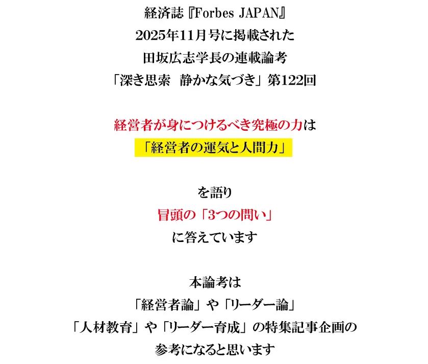 2025.10.01 田坂広志学長の最新論考 「経営者の運気と人間力」 がForbes JAPANに掲載。経営者やリーダーに求められる究極の力、「運気を引き寄せる力」とは何か、を語りました。