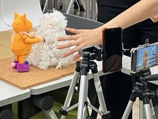 キャラクターである人形を直接操作してコマ撮りするので、一つ一つの画面をグループ全員でモニターしながらカメラマン役がシャッターボタンを押していくので、前期の実写制作と同様に全員が気持ちを一つにして集中して制作します。