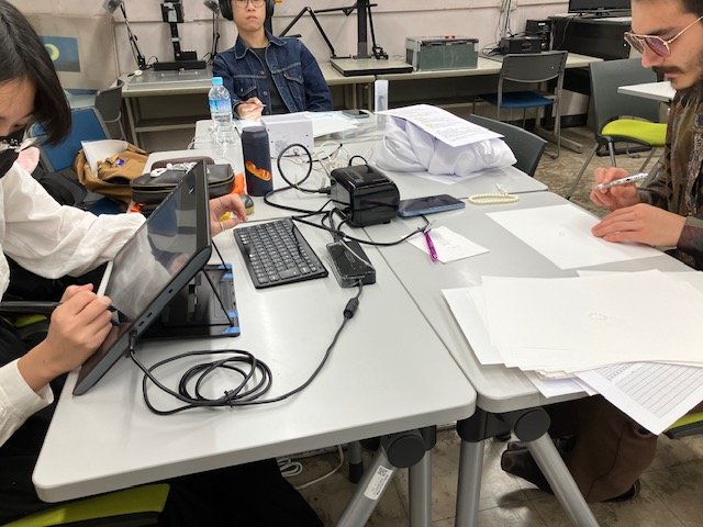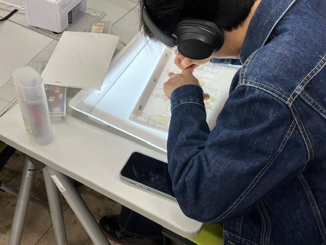 トレス台も使わなければタップも使わない、逐次描きで動画を描いていく学生。
