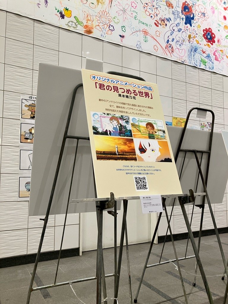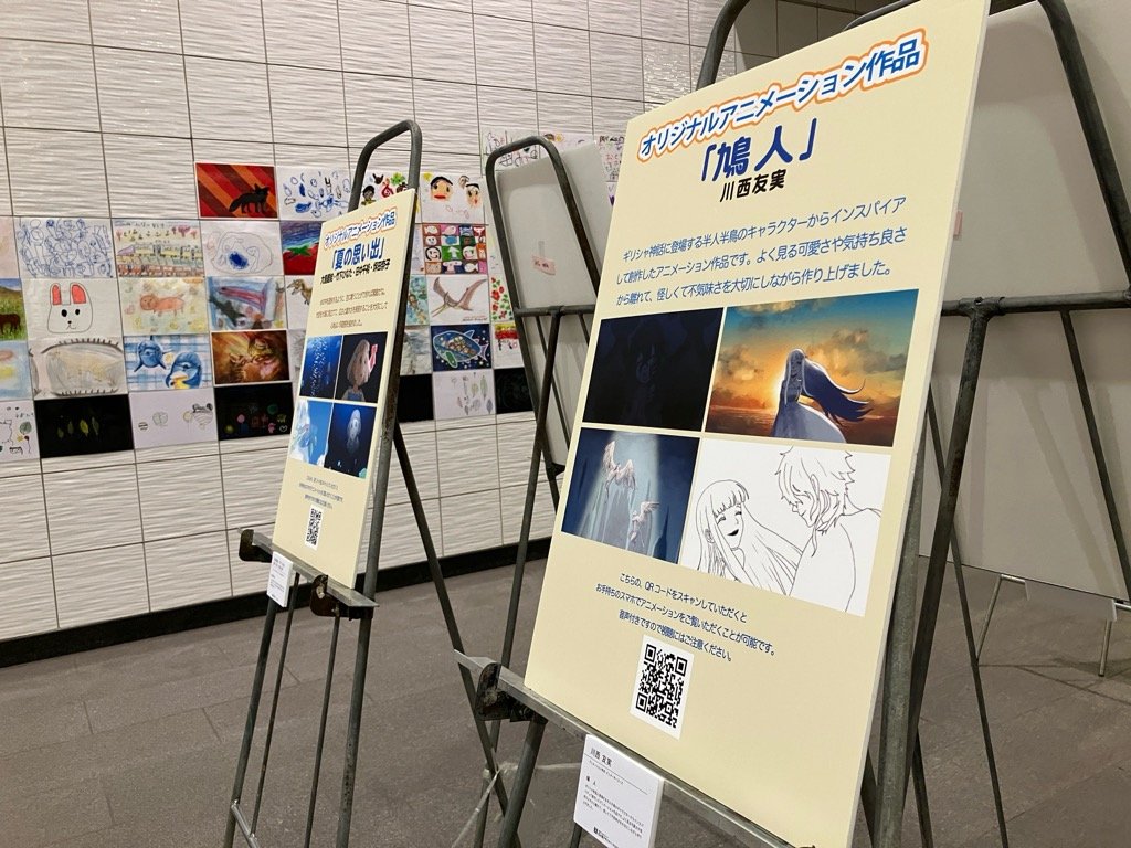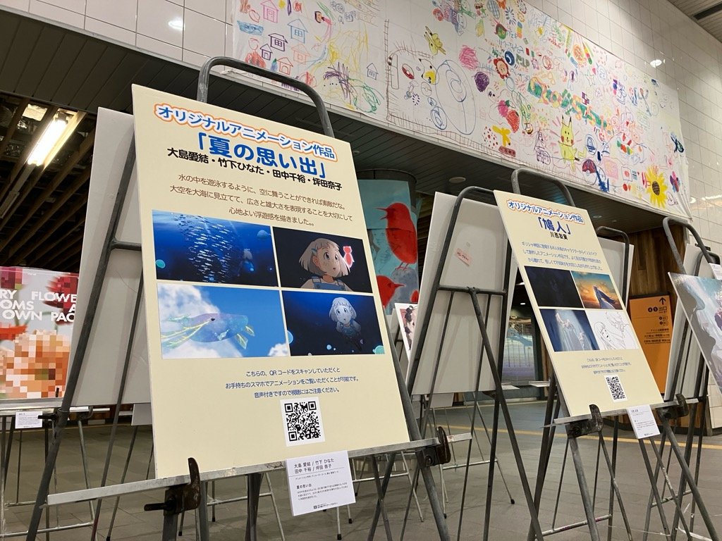 アニメーション学科は展示パネルにQRコードを載せていますので、現地でスマホでスキャンして読み込んでいただければ、手元でアニメを視聴していただけるしくみにしています。音声も聞けますので再生時にはスピーカーボリュームにご注意ください。
