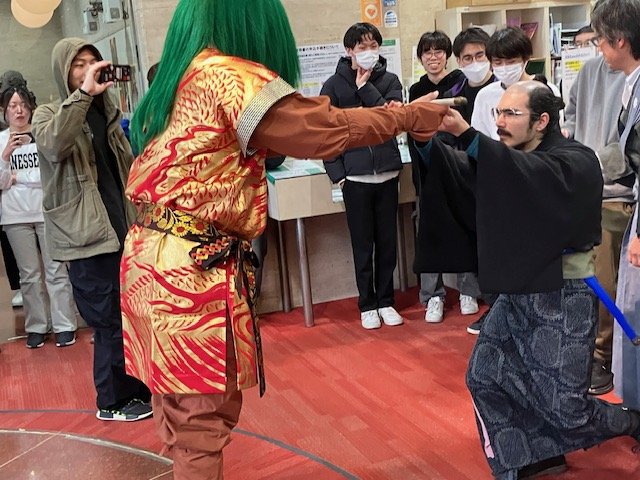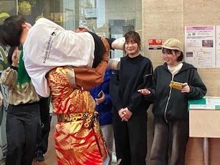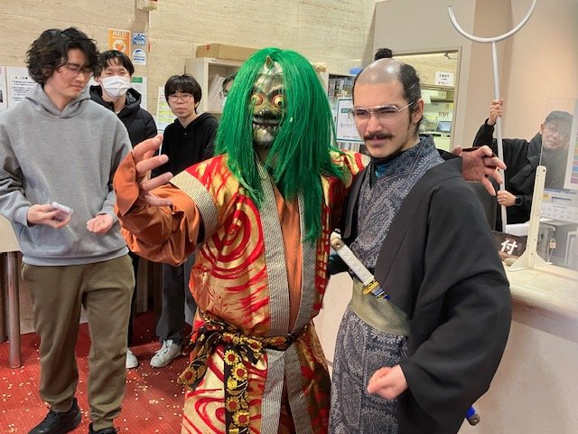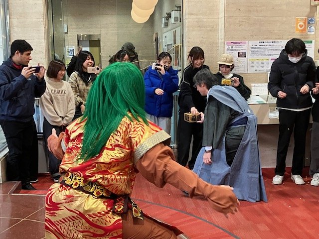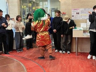 学生たちが豆まき鬼退治を楽しみました。