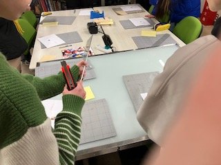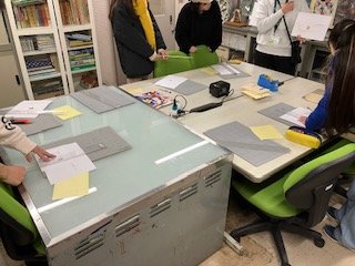 パソコンの画面の中で出来上がりが完結してしまう作業に慣れてしまった学生ですが、定規を当てて決められたサイズにカッターナイフで切断するという工作作業に戸惑う姿が新鮮です。