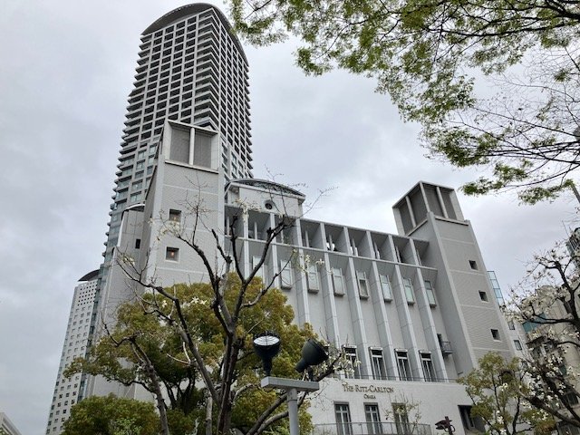 ホテル・リッツカールトン大阪の建物と、画面の中で印象に残る高いビルです。