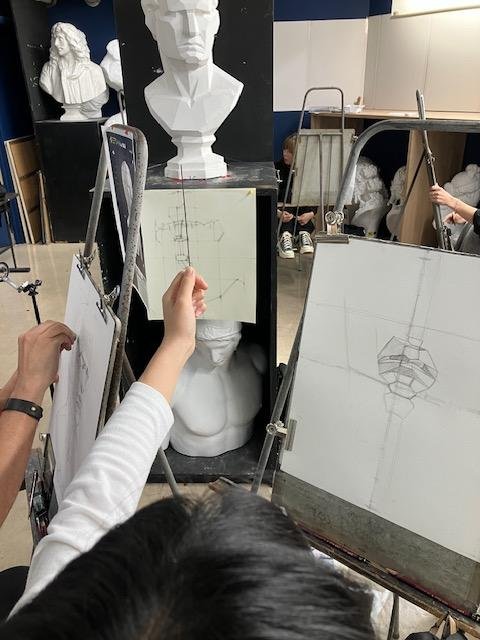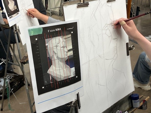 初めて石膏デッサンに取り組む新入生たちが
